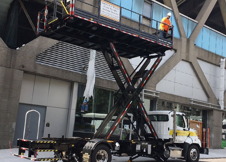 SPA bridge maintenance trucks feature scissor lifts designed for under bridge maintenance and repair work, and access for bridge inspections. Operators also can control their position on the lift platform. SPA scissor lift trucks provide 7000 LB capacity, 20’ Long Work Area, and 8’ full that expands 3’ on each